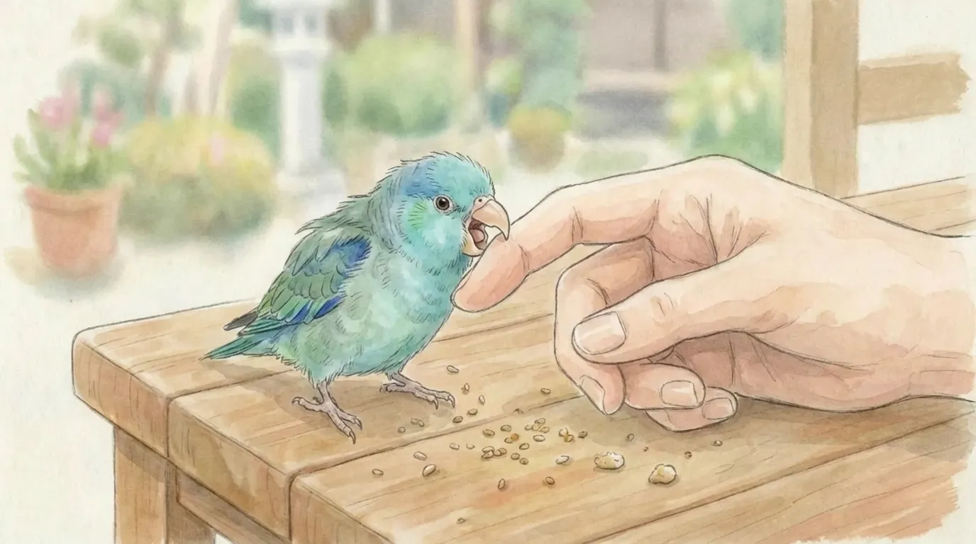 ステップ2:ケージ越しの「いい体験」を積み重ねる。ケージの隙間からおやつを渡す、穏やかに話しかけるなど、噛まれないやり取りを増やします。「手=いいことが起きる」と鳥に再学習させるのが狙いです。